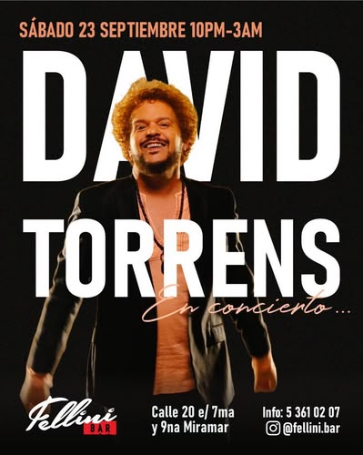 David Torrens estará en concierto este sábado 23 de septiembre, de 10:00 p.m. a 3:00 a.m., en el Bar Fellini.